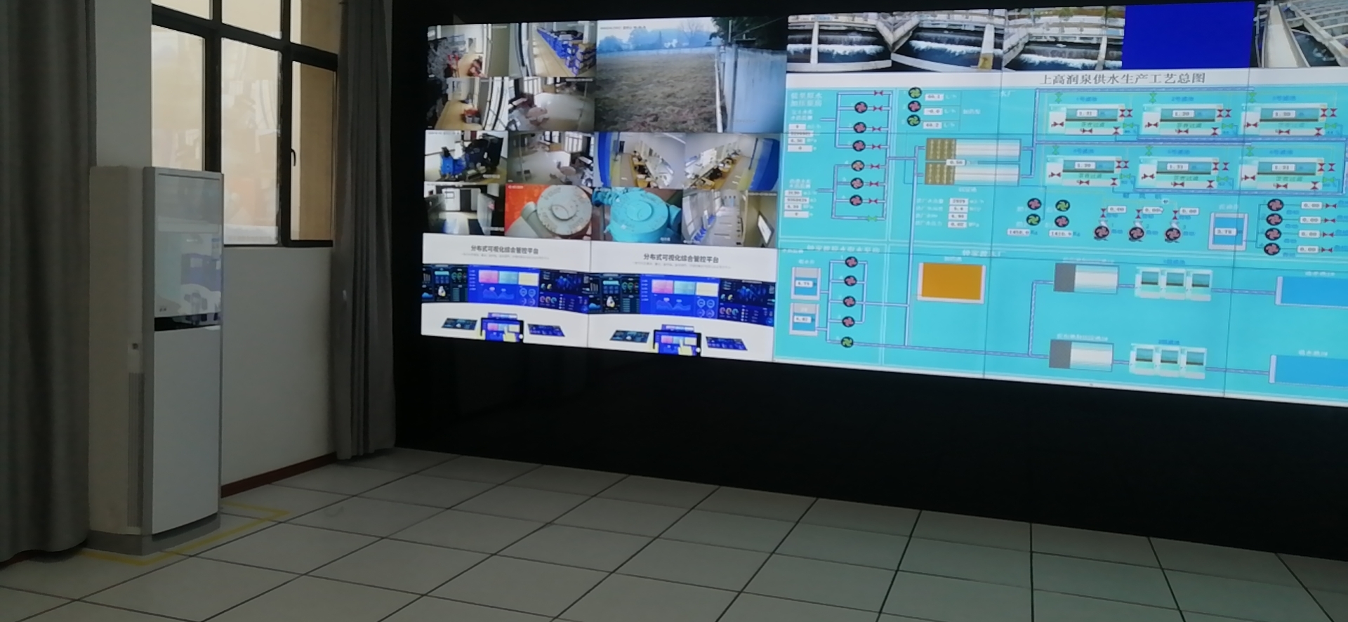 云拼接處理器一臺,可視化操控軟件一套,簡單的設備實現(xiàn)了客戶監(jiān)控視頻,生產(chǎn)工藝流程表,
